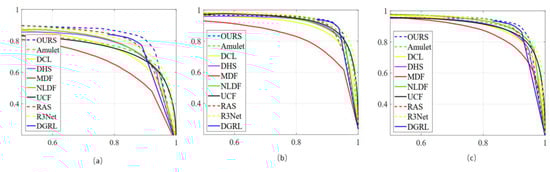 Next, we quantitatively analyzed the experimental results by comparing evaluation metrics. The results of the precision–recall (P-R) curves of each model on three distinct image datasets are presented in Figure 8. Specifically, Figure 8a displays the P-R curves of the individual algorithm on the DUTS dataset, Figure 8b reveals the P-R curves of each model on the ECSSD dataset, and Figure 8c shows the P-R curves of diverse approaches on the HKU-IS dataset. Figure 8 shows that the proposed method has a greatly improved accuracy and recall rate compared with those of the other methods.