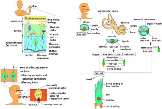 The mechanoreceptors and sensory cells in the human skin, ear, tongue, and nose have functions of tactile, auditory, gustatory, and olfactory sensations, respectively, as shown in Figure 1. We did not deal with the receptors in the visible sense because the photovoltaic mechanism is too complicated to present them easily and elliptically. In a special case for the human skin, the mechanoreceptors are recognized to be specified as cutaneous receptors: free nerve endings [22], Merkel’s disks [23], Krause end bulbs [24], Meissner corpuscles [25], Ruffini endings [26], and Pacinian corpuscles [27]. These tactile receptors are feasible to demonstrate the sensory systems. Although the auditory, gustatory, and olfactory hair cells are not categorized in the mechanoreceptors at the field of biomedical dissection, their configurations can be thought to be formed in a structured body, such as tactile receptors. For example, the auditory hair cell and the olfactory receptor cell can form like a ball, while the gustatory hair cell forms like a ball with a layer that has structures like an onion, as shown in Figure 1.