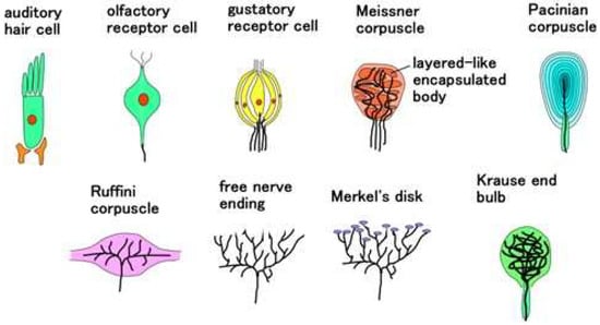 The receptors and hair cells are comprehensively summarized, as illustrated in Figure 2. Morphologically, Meissner’s corpuscles have a few encapsulated bodies, which are joined together. Pacinian corpuscles form many layered tissues. Ruffini corpuscles form longitudinally which involves the longitudinally elongated nerves. Free nerve endings and Merkel’s disk have widely spread nerves, and the latter form a lump in the tip of the nerve. The Krause end bulb forms like a ball, in which nerves are mixed through crosslinking and coil form. On the other hand, as for auditory and olfactory cells, it can be considered that they form an encapsulated shell. As for gustatory cells, they can be considered to have plural encapsulated shells which are respectively sensitive to the variegated tastes. In each encapsulated shell, biochemical reactions occur and can be transferred to the nerves. Therefore, we can suppose that the structure has encapsulated shells in which the nerves, including Ruffini corpuscles and Krause end bulbs, are not wired.