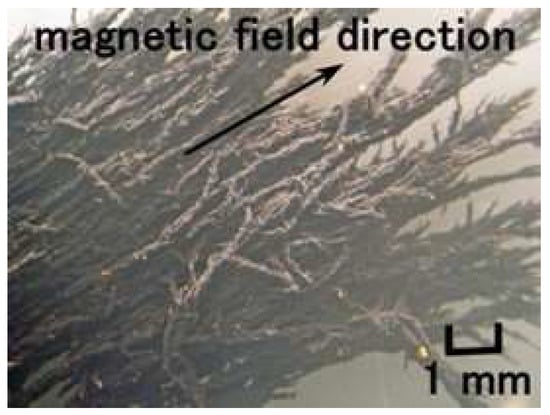 The prerequisite condition to morphologically mimic these receptors is to utilize a soft and elastic rubber, as the human body and skin are very soft and elastic. Shimada proposed an intelligent fluid suitable for compounding a rubber and investigated the optimization of the constitution and the properties of the rubber compounded with the fluid. At the first stage, our proposed fluid is a magnetic compound fluid (MCF), which is a magnetically responsive colloidal fluid that consists of 1-μm-diameter ordered metal particles such as Ni or Fe and 10-nm-diameter sphere magnetite (Fe3O4) particles coated by an oleic acid surfactant in a solvent, such as water and kerosene [28]. MCF is produced by compounding the magnetic fluid (MF), involving 10 nm Fe3O4 coated by a surfactant, with the metal powders. At the next stage, for the convenience of not needing MF, a novel magnetically responsive fluid, consisting of Fe3O4 and Fe metal particles, surfactant, water, kerosene, silicone oil (Q), and polyvinyl alcohol (PVA), has been proposed as a hybrid fluid (HF) [29]. For the purpose of developing a state-of-the art rubber which brings about the viability of merging together with any variegated discrepant rubber, such as natural rubber (NR), chloroprene rubber (CR), Q-rubber, and urethane rubber (U), among others, the solvents are mixtures of water, kerosene, Q and PVA. PVA has a role of emulsion polymerization so that those discrepant solvents can be mixed. MCF and HF have a paramagnetic property. When a magnetic field is applied, many needlelike or rug-like magnetic clusters are created not only in MCF or HF but also in the rubber compounded with MCF or HF, as shown in Figure 3, enhancing the electrical and thermal conductivity. Therefore, MCF and HF rubbers become conductive rubbers, so that they can be piezo-resistive and be utilized for the production of sensory receptors. The foregoing magnetism and magnetic clusters have been presented in detail in our previous studies [29].