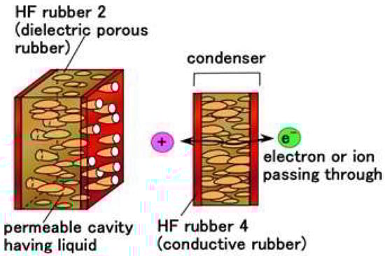 Regarding the structure of HF rubber 2, it has many porous rubber parts produced by this technique. HF rubber 2 can be produced involving any liquids through vacuum evacuation. Therefore, depending on the kind of liquids involved, the HF rubber 2 can be a condenser, a capacitor, and so on. In the present study, we produced the permeable HF rubber 2 involving a glycerin because it becomes a condenser. The ions and electrons then pass through HF rubber 2, as shown in Figure 4.