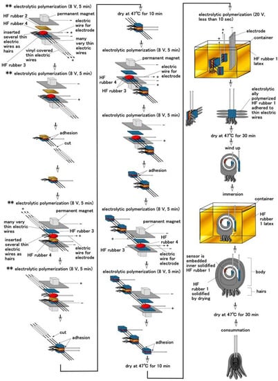 After HF rubbers 1–4 were prepared, the next phases of fabricating the artificial receptor involve the sensor production, as shown in Figure 5 and Figure A1 in Appendix A. In the present main text here, just one typical process, for a Meissner-type receptor, is presented, because the set of illustrations for all eight variegated production processes for the respective receptors is too long for delineation.