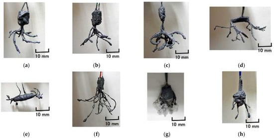 Figure A1 shows the production processes of layered Pacinian corpuscles, cylindrical Pacinian corpuscles, layered Ruffini corpuscles, cylindrical Ruffini corpuscles, free nerve endings, Merkel’s disk, and Krause end bulbs. In the case of Merkel’s disk, the hairs can be adhered on the U-rubber of the finger by the Al2O3 powder attached on the tips of the hairs, as shown in Figure A1f.