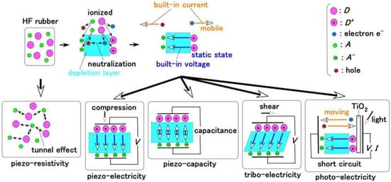 On the other hand, the particles and molecules are ionized through electrolytic polymerization on the HF rubber, so that the rubber plays the role as p-type and n-type semiconductors with the configuration of the ionized particles and molecules as acceptor A− (acceptor) and D+ (donor); these phenomena have been presented in detail in our previous study [34]. The electrons and holes created by ionization induced from the A and D, are mobile to generate a built-in current, and in the area between them, the electrical situation is regarded to be neutralized so that the area forms a depletion layer. Therefore, the electrical situation of A− and D+ is in a static state and occurs in a built-in voltage. Consequently, the condition corresponds to piezoelectricity for the application of compression, to piezo-capacity for electric charge, and to triboelectricity for the application of shearing, as shown in Figure 7, which has been presented in our previous study [35]. These conditions also correspond to a condenser, predominantly. In contrast, the materials with piezoelectricity and piezo-capacity are well-known piezo elements. In addition, a study has also been conducted focusing on other physical sensors with triboelectricity [36].