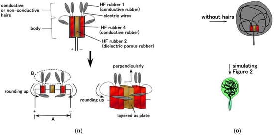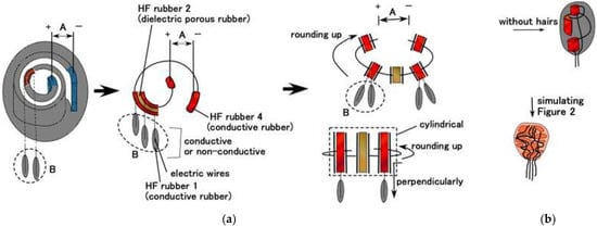As for Meissner corpuscles, when the hairs B are not used, the condensers made of HF rubbers 2 and 4 are wound, as shown in Figure 8a, and come down to, as shown in Figure 8b. The device squares with the type of Meissner corpuscles, as shown in Figure 2. In the same way, in case of the finalized fabrication without hairs B, the devices, as shown in Figure 8d,f,h,j,o, square with the layered Pacinian corpuscles, cylindrical Pacinian corpuscle, layered Ruffini corpuscles, cylindrical Ruffini corpuscles, and Krause end bulbs, as shown in Figure 2, respectively. As for the free nerve endings and Merkel’s disk, the finalized fabrication with hairs B, as shown in Figure 8l,m, squares with the ones shown in Figure 2, respectively. Thus, taking into account the electric circuit, the production process of our fabricated receptors effectively provides the configuration of the realistic receptors as shown in Figure 2.