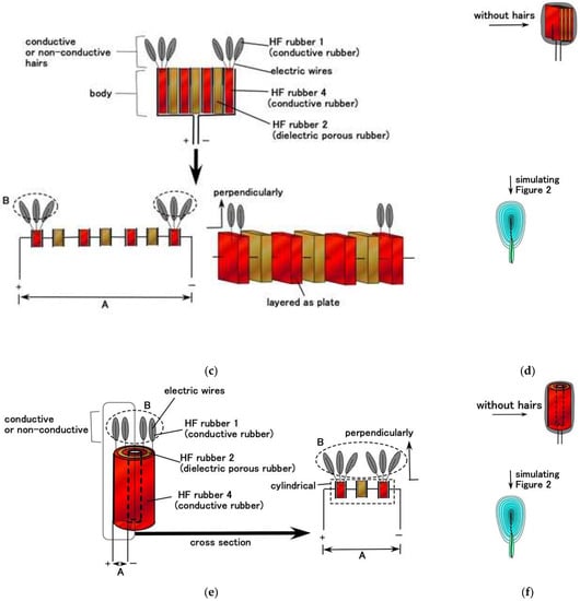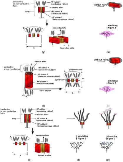 Consequently, MCF and HF rubbers can simultaneously have the overall foregoing electric conditions as shown in Figure 7. Although HF rubbers 1–4 provide the overall electric conditions, they each have a particular role as follows: HF rubber 1 involves a wire of the hair which is connected with HF rubber 2; HF rubber 2 has the role of condenser or capacitor as shown in Figure 4; HF rubber 3 has the role of outer cover of the receptor, and HF rubber 4 is adhesive. In contrast, other artificial haptic sensors such as e-skin [38] and physical sensor [39] play functions on the basis of a particular electric condition as shown in Figure 7 for their respective engineering and biomedical applications.