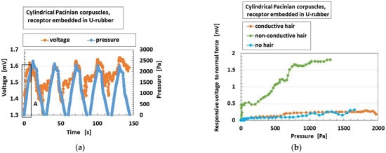 As for the application of the normal force, Figure 9a shows the exemplary response of the built-in voltage to the applied pressure in overall receptors in case without hairs. From the experimental data, we extract the built-in voltage to the pressure at the initial period as A, delineated in Figure 9a, indicating the electric response to the pressure. The parameter is called “responsive voltage to normal force”.