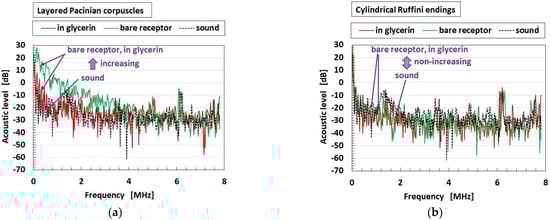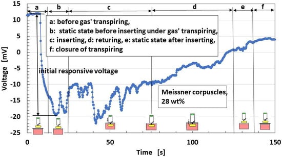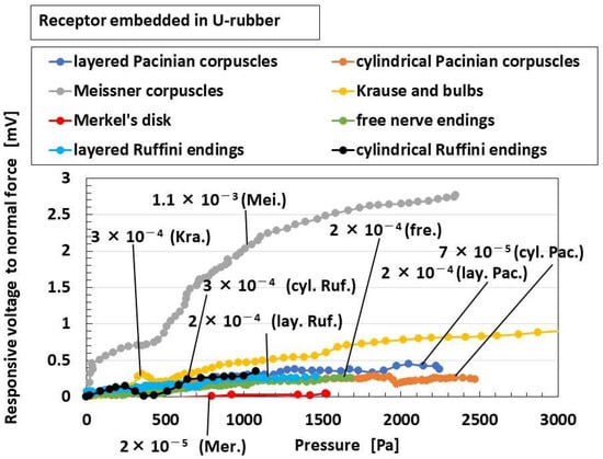 In general, the mechanoreceptor has mechanical and chemical properties as a response for extraneous stimuli from the external environment such as touching, vibration, heating, cooling, hearing, and odor, among others. The properties have been investigated, and the characteristics have been clarified in several categories: force, vibration, temperature, sound, smell, and so on [40,41,42,43]. The present experiment was conducted utilizing the classification of extraneous stimuli in terms of the following several responses.