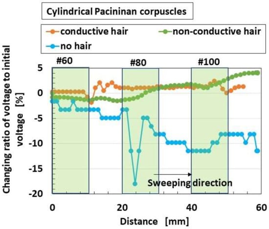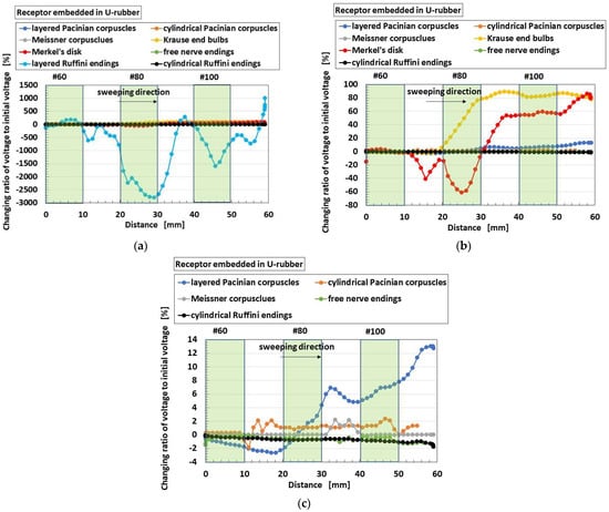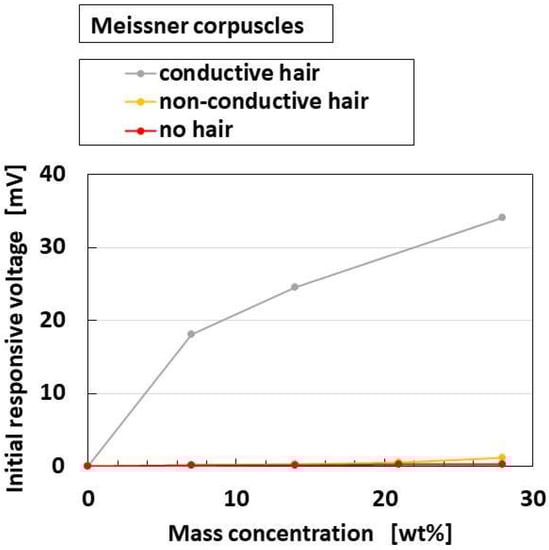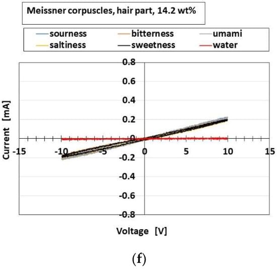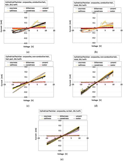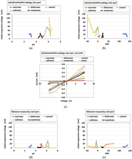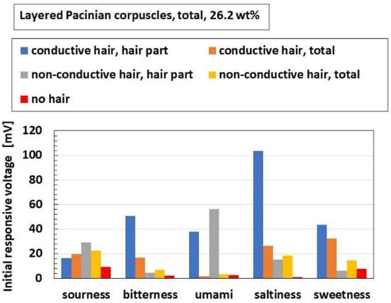 Figure 26 shows a comparison of responsive voltage to the liquids among the overall receptors in cases with conductive hairs and “hair part”. Figure 26a–c show the most response, while Figure 26d–f show less response; the presentation here is limited because there are many results. Larger changes of initial responsive voltage in the abscissa denote more response to the taste. The results show that the cylindrical Ruffini endings are most responsive to the liquids, followed by layered Pacinian corpuscles and Merkel’s disk.