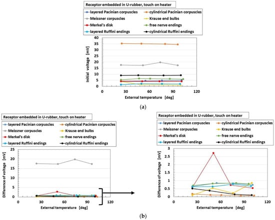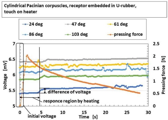 As for the application of thermal response, Figure 13 shows the exemplary response of the built-in voltage to the applied heat in overall receptors in the case without hairs. As shown in the figure, the parameter “initial voltage” means the response of the built-in voltage to heat in case of touching a thermal body, i.e., the surface of the heater or the water. The parameter “difference of voltage” means the changes of the built-in voltage inducing the internal thermal energy.