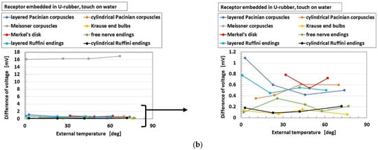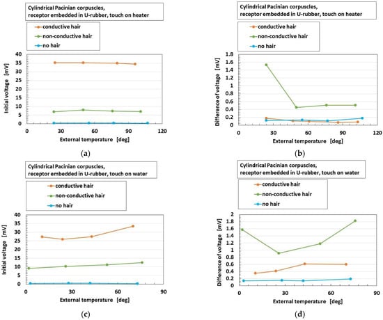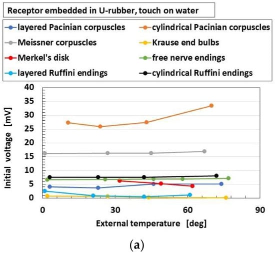 Figure 15 and Figure 16 show the overall comparison of these parameters to heat among receptors for heater and for water, respectively, in the case without hairs. As for “initial voltage”, cylindrical Pacinian corpuscles are the most responsive, followed by Meissner corpuscles for both heater and water. As for “difference of voltage”, Meissner corpuscles are the most responsive, followed by Merkel’s disk for both heater and water. The results show that the more complicated configuration of electric circuit in the receptor, as shown in Figure 2, is capable of transmitting more heat. These results are independent of the kind of thermal bodies of heater and water.