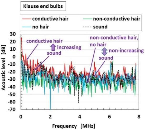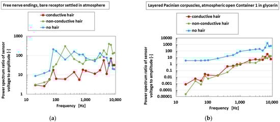 Regarding hairs attached to the receptor, we can produce three types of device: with conductive hairs, without hairs, and with nonconductive hairs. The first corresponds to the production as shown in Figure 5 and Figure A1 in Appendix A. The second and the third are two other types. The receptor without hairs delineated as B “no hair”. The second receptor B is delineated as B “non-conductive hair” (the production process ensures that the hairs B do not touch the electric wires for electrodes as shown ** in Figure 5 and Figure A1 in Appendix A). In contrast, the case where the hairs B are conductive (the production process ensures that the hairs B touch on the electric wires for electrodes) is called “conductive hair”.