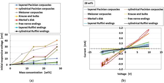 Figure 23a shows the comparison of responsive voltage to the odor among overall receptors, in the presence of conductive hairs. In contrast, Figure 23b shows the olfactory relationship between I and V by potentiostat (HA-151B). In the case of the relation between I and V, larger current and larger area of the loop between I and V denote more response to the odor, in the presence of hairs. From both the initial responsive voltage and the olfactory relationship, cylindrical Pacinian corpuscles and Meissner corpuscles are most responsive, followed by Merkel’s disk.