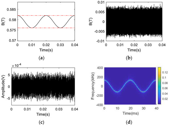 The numerical simulation results of the NSS-NMR effect in the sinusoidal time-varying magnetic field are shown in Figure 2. Figure 2a is the waveform of the sinusoidal time-varying magnetic field with a period of 0.02 s, amplitude range of 0.576 T to 0.582 T and the data length selected for the simulation as0.04 s. The red dotted line represents the magnetic field range corresponding to the bandwidth of the RF excitation signal. It should be emphasized that the broadband RF excitation applied in the simulation is identical to that in the pulsed time-varying magnetic field numerical simulation. Figure 2c displays the NSS-NMR time-domain response of the macroscopic magnetization component of the sinusoidal time-varying magnetic field after digital down converters (DDC) due to its low frequency resolution. Figure 2c shows that the is time-varying and its duration is 0.04 s. Figure 2d describes the time–frequency diagram versus the offset frequency from the corresponding median value (=0.579 T) of the upper and lower ranges of the sinusoidal time-varying magnetic field. It can be seen from Figure 2d that a sinusoidal waveform is observed, which is consistent with the sinusoidal time-varying magnetic field waveform displayed in Figure 2a. The simulation of the above aperiodic and periodic time-varying magnetic field NMR experiment verifies the NSS-NMR effect and shows the feasibility of the magnetic field measurement by the NSS-NMR theory.