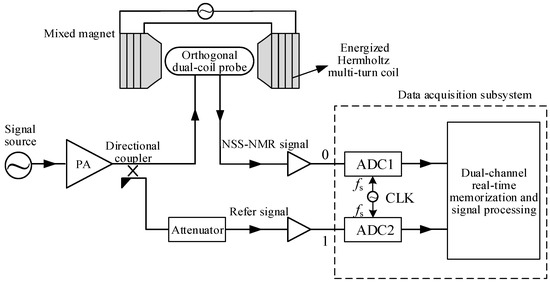 An NSS-NMR experimental system mainly includes a mixed magnet, an RF broadband signal source, an orthogonal dual-coil probe, a directional coupler, an attenuator and a set of data acquisition subsystems, as displayed in Figure 4. The RF excitation signal, which is a band-limited white noise signal with a frequency bandwidth of 300 kHz that is generated by the signal source, is sent to the input of the directional coupler after amplified by the power amplifier (PA). The two-way output signals from the directional coupler feed into the transmitting coil of the orthogonal dual-coil probe and the reference receiving port “1” of the data acquisition subsystem, respectively. The NSS-NMR signal, the leakage part of the transmitting signal and the noise outputting from the induction coil of the probe feed into port “0” of the data acquisition subsystem. The port “1” signal can serve as a reference signal for the following subsequent signal processing. The sampling rate is 100 MHz and the total acquisition time is set to 50 ms to cover multiple periods of the longitudinal time-varying magnetic field.