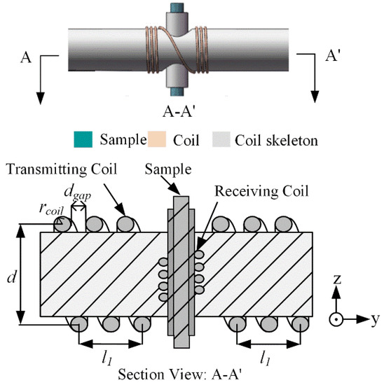 A common coil, such as a solenoid, Helmholtz, saddle and birdcage coil, could be used to fabricate an NMR probe [22,23,24,25]. The solenoid coil possesses a higher excitation efficiency and better distribution homogeneity of the magnetic field [26]; therefore, it was selected to design the transmitting coil and the receiving coil of the orthogonal dual-coil installed in the NSS-NMR experimental system. The orthogonal placement of the transmitting coil and receiving coil could obviously increase the isolation between the two coils. As revealed in Figure 5, the 1H nuclear sample that is encapsulated inside a short tube is positioned in the internal area of the vertical polyformaldehyde (POM) stick. The solenoid coil wrapping around the vertical POM stick is defined as the receiving coil. The six-turn transmitting solenoid coil is divided into two parts and wrapped on both sides of a thicker horizontal POM stick. The diameter of the enameled wire is 0.5mm, and the net length of the transmitting solenoid is 4.5 mm.