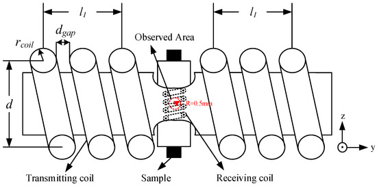In the above equation, the SNR is relevant to the distribution homogeneity of the RF excitation field, the resonance frequency , the excitation efficiency , the macroscopic magnetization , the sample volume and the noise RMS voltage . Since the NMR signal is a macroscopic manifestation produced by the precession and nutation of all the spin nuclei with a non-zero magnetic moment in the sample space, the poor distribution homogeneity of the RF excitation field would eventually result in the gradual phase dispersion of the magnetization in the nutation plane [20,21]. The homogeneity parameter is related to many factors, such as the coil type, the length and diameter and the turn gap of the exciting/inducing coil, the gap between the coil and the wall of the magnet.