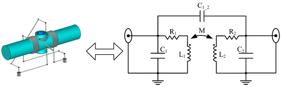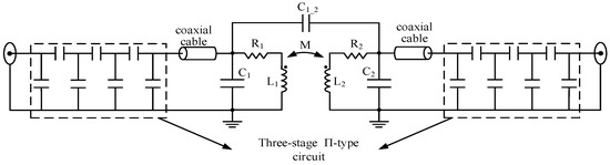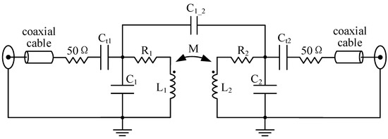 The orthogonal dual-coil probe proposed in this paper consists of two mutually orthogonal solenoids; therefore, the equivalent lumped-parameter circuit could be depicted as Figure 7, where the mutual inductance and mutual capacitance between the two coils, the self-inductances and , the turn capacitances and and the ohm resistance and are included in the equivalent circuit.