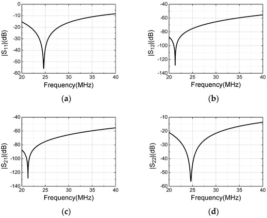 The S−parameters of the remote resistance matching for the orthogonal dual-coil probe (a) S11; (b) S12; (c) S21; (d) S22.