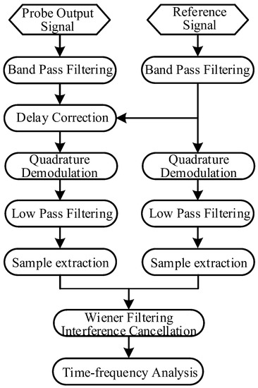Due to the finite isolation between the T/R coils, there is a small part of the RF excitation signal leaking from the input port to the output port. Although the leakage is very small, it is still much greater than the power of the NSS-NMR signal. Therefore, it is necessary to cancel the RF excitation leakage from the compound of the output signal to finally extract the NSS-NMR signal. As a result, a Wiener adaptive filtering interference cancellation algorithm is used in the data processing scheme. The reference signal comes from the coupling port of the directional coupler. The overall signal processing scheme includes band-pass filtering (BPF), delay correction, quadrature demodulation, low-pass filtering (LPF), sample extraction, adaptive interference cancellation (Wiener filtering) and time–frequency analysis, as depicted in Figure 13. The delay correction processing is for aligning the group-delay-time (GDT) of the probe output signal to that of the reference signal. The time-difference value corresponding to the peak of the cross-correlation function between the reference signal and output signal of the probe might be used to align the two signals. The quadrature demodulation, LPF and sample extraction are for outputting the digital baseband I/Q signals to conduct the subsequent adaptive filtering and time–frequency analysis.