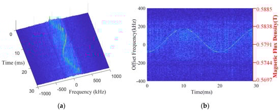 After the interference cancellation, the processed data are divided into 228 sub-segments for carrying out STFT. Each sub-segment consists of 1024 sampling points with 75% overlapped points. The time–frequency diagram of the data of these segments versus the offset frequency from the NMR frequency corresponding to parameter is displayed in Figure 15a. A sinusoidal waveform could be clearly observed, which demonstrates the existence of the NSS-NMR effect, and the NSS-NMR signal has been successfully extracted. In addition, when the excitation RF power is low, the NSS-NMR signal is also weak in certain time segments. The inverted magnetic flux density of the mixed magnet by the Larmor precession relationship is shown in Figure 15b, which indicates that the range of time-varying magnetic field range is from 0.576 T to 0.582 T and the time-varying period is 20 ms. The experimental results are identical to the actual parameters of the mixed magnet. There is only a slight difference in the display clarity between the simulation and the actual experiment, which is mainly due to the spectral peak of the weak signals in certain segments submerged by the background noise.