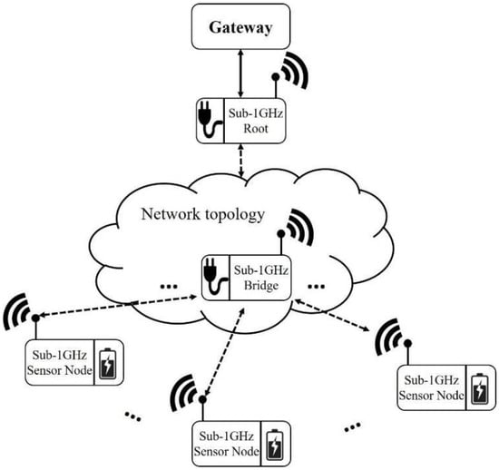 The common frequencies of wireless transmission are divided into Sub-1 GHz, 2.4 GHz, and 5 GHz. The high frequency has a faster data rate; however, the 5 GHz signals would cause a higher attenuation than the others when it passes through obstacles. The corresponding coverage is also less than Sub-1 GHz and 2.4 GHz [,,,]. However, the Sub-1 GHz has wider coverage and lower power consumption owing to the corresponding narrow bandwidth and low frequency.