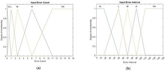 Membership functions for antecedent parts: (a) error count and (b) error interval.