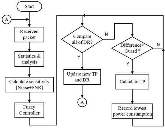 According to the analysis of transmission performance, power consumption, and fuzzy controller, a fuzzy-based data rate and transmission power control algorithm was proposed. The flow chart for the control algorithm is illustrated in Figure 9. After receiving the response packet, it performs statistics and analysis about the packet. Furthermore, all the input parameters are substituted into the fuzzy controller to obtain a crisp value for determining data rate and transmission power. If there is any interferece during the transmission time, it will be reflected in the value of SNR and PER. As a result, these two parameters are used to adjust the input of the fuzzy system. We calculate the differences in RSSI and sensitivities of eight data rates as