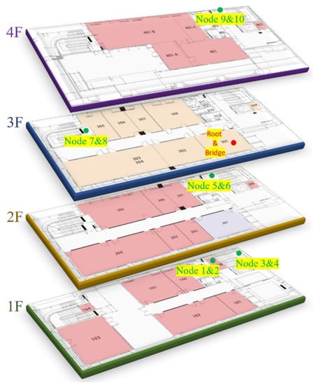 The TDMA polling period is 10 s in the experiments. The root, bridge, and 10 sensor nodes are placed in different positions. The sensor nodes are divided into experimental and control groups, and placed in five different locations for testing. The experimental site is located in the Sixth Hall of Engineering, National Yunlin University of Science and Technology, Taiwan. Figure 10 illustrates the configuration diagram of the nodes’ position. The red dots are the root and bridge, and the green dots are the sensor nodes. The sensor nodes are set in five different positions, and there are two sensor nodes for the experimental and control groups in each position. Each sensor node is numbered 1 to 10 for analyzing experimental results easily; odd numbers 1, 3, 5, 7, 9 are experimental groups, and even numbers 2, 4, 6, 8, 10 are control groups.