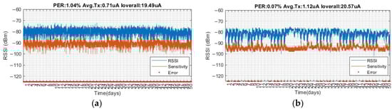 The offsets of each data rate are presented in Table 3. Substitute the offsets into Equation (4) to obtain the receiver sensitivity under PER 1%. Table 4 presents the values of SNR for each data rate under PER 1%, and the fixed value indicated in Table 4 is substituted into Equation (3) to obtain a sensitivity. The sensitivity is a dynamic value determined by time-varying noise. When the RSSI which is obtained from the received packet is higher than sensitivity, it means that the PER will be below 1% in theory. The lower the sensitivity, the better the receiving ability is. When the noise is fixed, the higher data rate results in a higher sensitivity and worse receiving ability; however, it reduces the power consumption by reducing the transmission time.