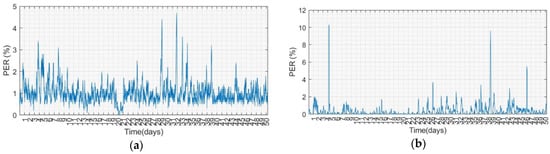 Figure 12 illustrates the moving average PER curve for a sliding window of 1000 of sensor nodes 5 and 6. The PER of the experimental group with the algorithm is approximately 1%, whereas the PER value of the control group is less than 1% most of the time. The control group is located outside the office on the second floor; therefore, there are more people walking around to cause interference. From the statistical results, the overall PER of the control group is low, but there are several PER values that are high owing to external interference. Compared to the PER curve of the experimental group at the same timeline, the PER is lower than the control group. Although the power consumption of the two are similar, the PER performance of the experimental group is relatively stable.