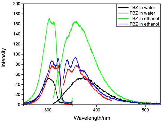 Excitation and emission fluorescence spectra of thiabendazole (TBZ) (300 ng/mL) and fuberidazole (FBZ) (30 ng/mL) in water and ethanol.