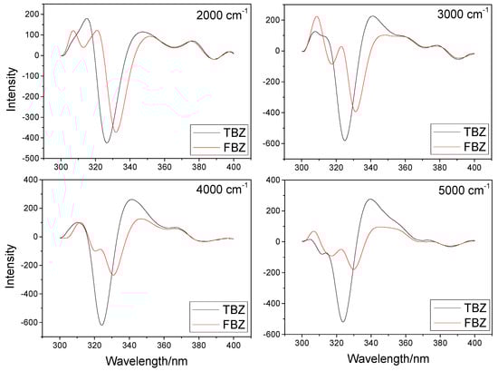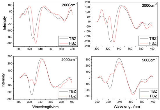 As shown in Figure 2, the negative peak at 320~340 nm represents the primary distinction between the spectra of TBZ and FBZ. From the figure, we can see that the peak width of the second derivative constant energy synchronous fluorescence spectrum is narrow and the shape of the peak is sharp, which provides convenience for further detection. The selected constant-energy differences have a certain degree of spectral resolution, and for our experiment, we chose the constant-energy difference of 2000 cm−1.