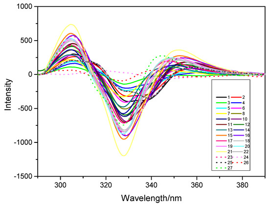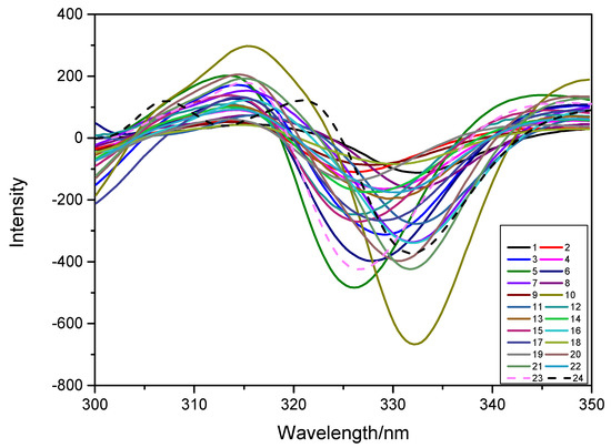 In the dilution method, the calibration set was constructed using diluted wine samples as the matrix. The concentration is shown in Table 5, and the second derivative constant-energy synchronous fluorescence spectra is depicted in Figure 7.