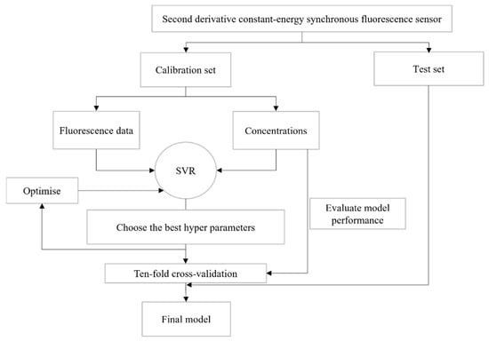 With the derivative constant energy simultaneous fluorescence sensing technique, we obtained the wavelength points of the corresponding calibration set. We took these fluorescence data as inputs and the concentrations of the corresponding TBZ and FBZ as outputs. Through ten-fold cross-validation, we adjusted the hyperparameters and obtained the best model. Finally, we used the obtained model for the prediction of the test set. The process is shown in Figure 4.