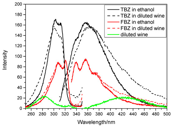 Excitation and emission fluorescence spectra of TBZ (300 ng/mL) and FBZ (30 ng/mL) in ethanol and diluted wine samples and diluted wine.