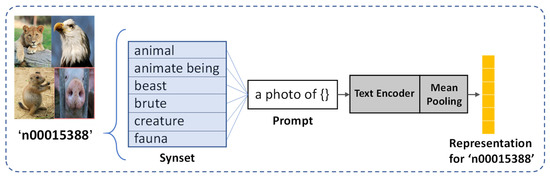In addition to the widely spread hierarchy knowledge graph, we further explore the potential of CLIP [47] used in the construction knowledge graph. CLIP has now become a de facto general-purpose framework for visual-semantic tasks because it establishes a strong connection between visual and semantic signals, and is also very convenient for downstream tasks. For this purpose, we use the CLIP Transformer text encoder to obtain a class representation for each concept. We first pick up the WordNet id (wnid) of each concept and get all the words in the synset of the wnid. Note that about half of the class concepts in ImageNet21K contain more than one synonym. Then, prompt engineering is used to create a prompt template for each word, and we take it as input for the CLIP text encoder. Finally, we perform mean pooling on all synonym semantic vectors and obtain the final class representation of the concept. A specific example is shown in Figure 4.