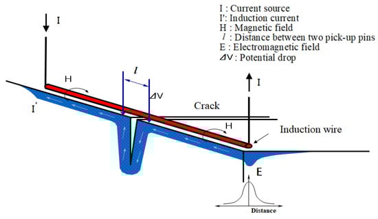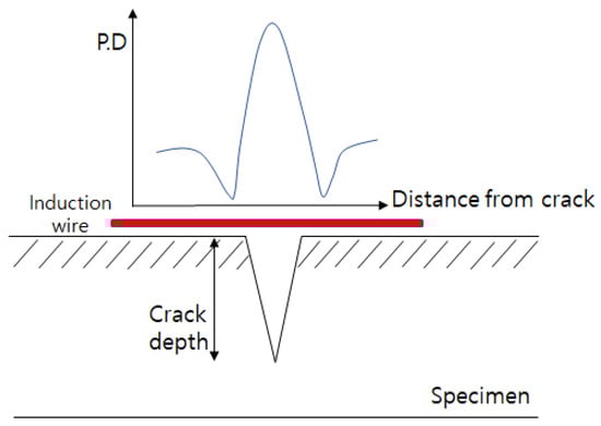 Because it is same as the ACPD technique, the induced current also flows preferentially across the surface layer of metals (or metal specimens) based on the skin effect. The skin depth at which the current reduces to 1/l times lower than the current density at the surface can be expressed as shown in Equation (1). Additionally, the relationship between the potential drop and other properties can be expressed as shown in Equation (2).