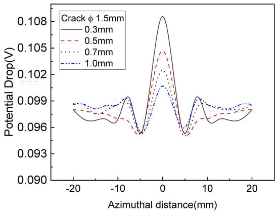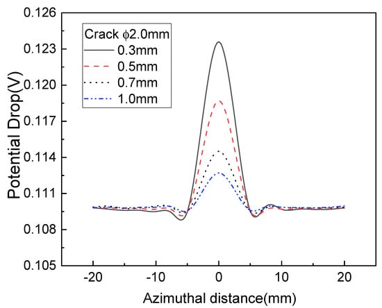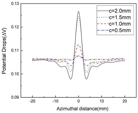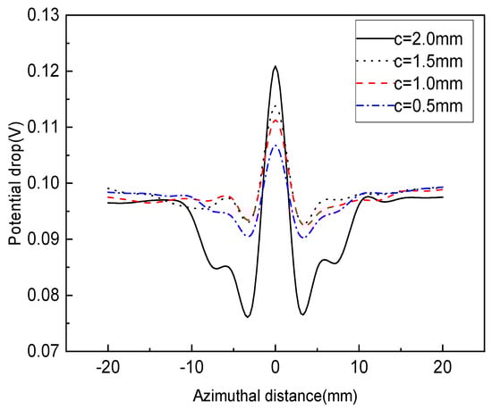 Kwon et al. proved that, since it is easy for a narrow probe to detect a defect, it is possible to more intensively detect the current induced along the defect surface with a narrower probe than with a wider probe [23]. Therefore, it can be seen that, when using the induced AC potential drop technique, the narrower the interval of a probe is, the more accurately the defect can be measured. Figure 7 shows the potential drop distribution based on the position of the probe. Since a large difference is measured when the measuring terminal is located at the defect end, which is across the defect, and when the defect is located in the center of the measuring terminal, a small difference is measured, the potential drop distribution forms a ∧ shape. In this way, Figure 7 shows that the flow of the induced current changes in line with the edge effect at the defect end. In addition, it is known that the deeper the defect is, the bigger the potential drop at the defect end, meaning this effect relies on the depth of the defect. From this, it can be surmised that the potential drop around a defect changes as an indicator of the existence of the defect, and varies depending on the depth of the defect.
