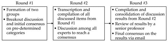 The workshop was held in Morgantown, WV, over one day. At the beginning of the workshop, the experts were presented with the preliminary findings of field experiments [] conducted by the authors to bring them up to date regarding EXO studies in construction. The experts were also informed about the procedure and expected outcomes of this activity. Then, the Delphi process was initiated, as illustrated in Figure 1.