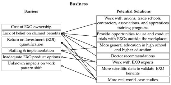 During the workshop, the expert panel identified barriers in the business category as well as potential solutions to those barriers. Figure 2 shows the mapping of the potential solutions to the identified barriers. No obvious solutions were identified for the barrier of “cost of EXO ownership”, calling for further studies to explore solutions to this issue.