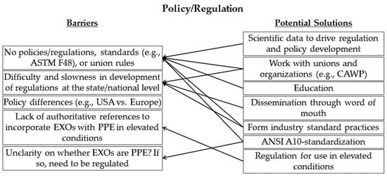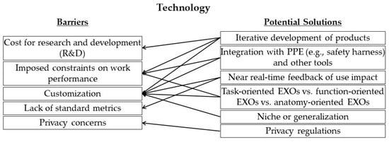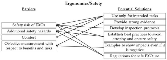Many other industries, such as manufacturing [], agriculture [,], baggage handling [], logistics [,], medical care [], and the automotive [,,] and ship maintenance industries [], are exploring potential uses for EXOs. Currently, the rate of EXO use in these industries is also limited. The results of this study may shed light on the pros, cons, opportunities, and challenges of EXO development with respect to adoption and use in these industries. For instance, the authors believe that the facilitators, barriers, and potential solutions to the barriers identified for the business and organizations categories in this paper are likely to be relevant to other industries. While considering technological modifications of EXO products necessary for a certain industry, the outcomes in the technology category might provide useful insights regarding the factors that need to be scrutinized. The outcomes with respect to policies and regulations from this paper may also be thought-provoking for other industries, as worker safety concerns are quite similar across industries. Regarding the ergonomics/safety category, the safety concerns elaborated on in this paper that need to be addressed regarding the adoption of EXOs are pertinent to many of the workers in other industries, as they, too, are susceptible to WMSDs. Finally, the workers’ concerns identified in the end user category represent the concerns of workers, regardless of the industries they belong to. As a result, the findings of this paper are beneficial not only for construction but also many other industries that are actively evaluating the potential use of EXOs and working toward their adoption.