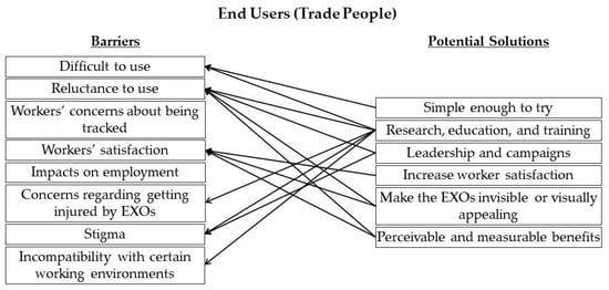 The wide adoption of EXOs in the construction industry will strongly depend on their acceptance by trade professionals (end users). The variety of barriers that can cause rejection of EXO products among workers or slow down the process of EXO adoption in construction workplaces has been identified in this study. The potential solutions to these barriers have been discussed. The identification of the barriers will help inform end users regarding the potential risks given the status quo regarding EXO products and enable the worker community to understand the steps needed for the adoption of EXOs to be successful. Some of the technological modifications required to meet the needs in construction environments have also been identified from the end users’ perspective. Manufacturers and researchers are encouraged to leverage these findings to continually improve EXOs in collaboration with workers.