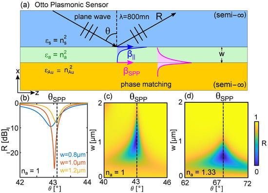 The transmission spectra used to maximize Equation (2) typically have minima at the phase matching (PM) condition between dielectric and plasmonic modes []. The shift of the PM condition as varies, thus often provides a first estimate of the sensitivity. However, we wish to emphasize that, in practice, the phase-matching condition in isolation provides insufficient information to infer the spectral minima, and can even lead to incorrect conclusions. In fact, the physics behind such resonant spectra is quite complex [], due to the subtle and often counter-intuitive interplay of phase matching, modal coupling, interference, and losses. To highlight this subtlety, it is useful to revisit the textbook example [] of possibly the simplest plasmonic sensor implementation, based on the Otto plasmonic coupler [], shown schematically in Figure 1a. In this particular scheme, a plane wave at wavelength 800 nm is incident from the top of a semi-infinite silica prism (refractive index: ) towards its bottom surface, at an angle with respect to the normal. The spacer (green) is the analyte. In the absence of a metal, and for , total internal reflection leads to an evanescent field at the silica/analyte interface. By introducing a gold layer (refractive index: ), spaced a distance w from the edge of the prism, the evanescent field can excite a bulk SPP if momentum is conserved, which occurs at an angle . In the first instance, the SPP excitation angle can be calculated analytically by recalling that the bulk SPP has a propagation constant of