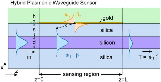 We now turn to plasmonic waveguide sensors, which are the focus of this work. In this case, sensor performance is based on directional coupling [,], which also relies on resonant energy transfer between waveguides, and is used for sensing applications in several different contexts [,,,]. Compared to the Otto configuration, hybrid plasmonic waveguide couplers provide a pathway for photonic circuit integration, as well as more localized confinement and higher spatial resolution. Figure 2 shows a schematic of an example of a chip-scale hybrid plasmonic waveguide coupler, which we will use as the example platform to illustrate our method. We consider a one-dimensional slab device supporting two-dimensional propagation, grounding our theoretical discussion to a realistic device which we can also use to compare with full numerical calculations. Such a waveguide coupler is described by many parameters, i.e., refractive indices, width, spacing, and wavelength. Here, the dielectric waveguide (purple) is taken to be a silicon slab (width: , refractive index: ); the metal waveguide (yellow) is taken to be gold (thickness: ; with the permittivity following from the Drude model []; edge-to-edge separation: ). The background is silica [] and the region above the gold is covered by an analyte (refractive index range: ). Light is injected into the dielectric core, which in turn couples to the two modes in the sensor region, yielding an overall transmission spectrum that depends on including the wavelength , length L, and refractive index .