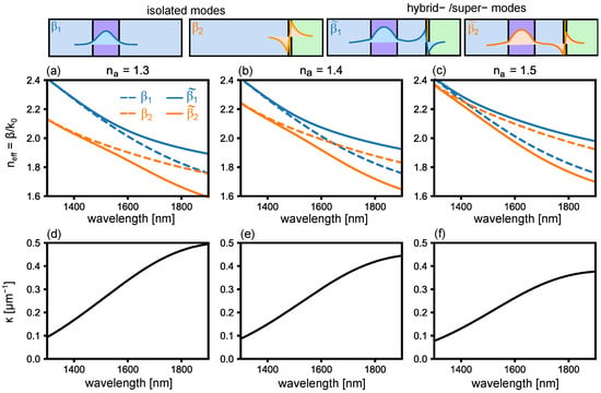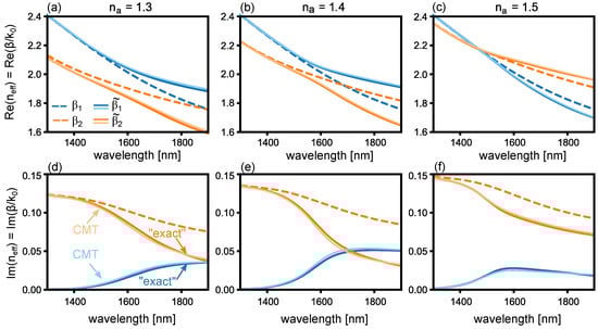 We notice that the effect of increasing the analyte index is to shift the propagation constant to higher values. This, in turn, changes the point at which and cross: at such a point, the and anti-cross. The associated splitting of with respect to is quantified by via Equation (8), which in turn is plotted in Figure 3d–f. The wavelength-dependent coupling dictates the transmission spectrum, which for the lossless case has been considered extensively [,].