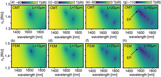 Transmitted power by the plasmonic sensor as a function of and for using (a) CMT, and (b) FEM. (c,d): same as (a,b) for . (e,f): same as (a,b) for . (g,h): same as (a,b) for . EP: exceptional point.