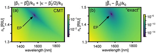 The exceptional point is thus an important parameter for plasmonic directional couplers in general, and plasmonic sensor designs in particular, because it defines the point beyond which resonant coupling is not supported. Our formalism immediately provides a rapid way of identifying it, in terms of intuitive coupling- and loss-parameters. To illustrate this, Figure 6a shows a plot of in the phase space considered, and which has a zero at the exceptional point as per Equation (11). A comparison with the exact supermodes is shown in Figure 6b, which plots as a function of and . An EP is found at the point where this function is zero as per Equation (10), consistently with coupled mode theory.