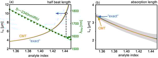 which provide an estimate of the length scale over which the power in each mode decays by a factor of . Figure 7a (left axis) shows the calculated as a function of analyte index , which is in the range of 2–10 . The associated average of the two supermodes is shown in Figure 7b. Note that the beat length is here comparable to (or longer than) the absorption length, making short devices necessary for practical applications.