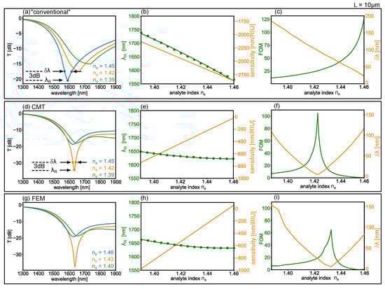 We now compute the FOM from the CMT method for , quantitatively analyzing the spectra which produce the colour map in Figure 5a. Figure 8a plots the spectra at the analyte index as labelled. Note the important differences with respect to the conventional case in Figure 8. First, a plot of vs. , shown as green circles in Figure 8e (left axis), indicates a sensitivity which is several times smaller (orange line, right axis). Second, the minimum does not increase towards the exceptional point, but has a local minimum near , due to resonant coupling, as shown in the orange curve of Figure 8f (right axis). As a result of this narrow linewidth, however, the FOM reaches values of up to ∼100, as illustrated in the green curve of Figure 8f (left axis). This is broadly consistent with the same analysis using finite element calculations, shown in Figure 8g–i—the only difference being a small shift in the analyte index where the high FOM occurs. Therefore, we expect our CMT approach to be a valuable first step in device design, providing an estimate of the plasmonic sensor performance using low computational resources and simple modal parameters, which should ideally be followed by a full detailed calculations in the parameter subspace of interest, e.g., via finite element [], or eigenmode [,] calculations.